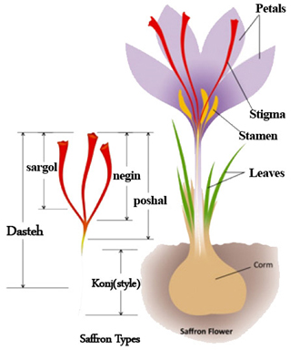 Saffron is a small, multi-annual plant with an approximate height of 10 to 20 centimetres, with narrow, long leaves that have been ejected from the middle of the corm. These leaves have a stem with flower which ends with one to three flowers. Each one of these flowers has six petals that are purple. Each flower has three stamens and an anther leading to a three-branched stigma in a bright red colour. This style and the red colour stigma at the end of the style are the famous, fragrant and flavoured part of saffron plant that is used.